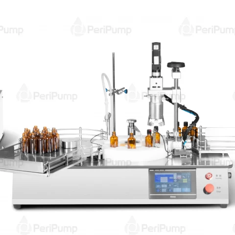 The operator only has to feed the empty vials to the rotary table and, after filling, place the individual screw caps on the vial. The rest, such as filling the vials and screwing on the screw caps, is done by the system itself. Finally, the filled and screwed vials are collected and can be labelled.